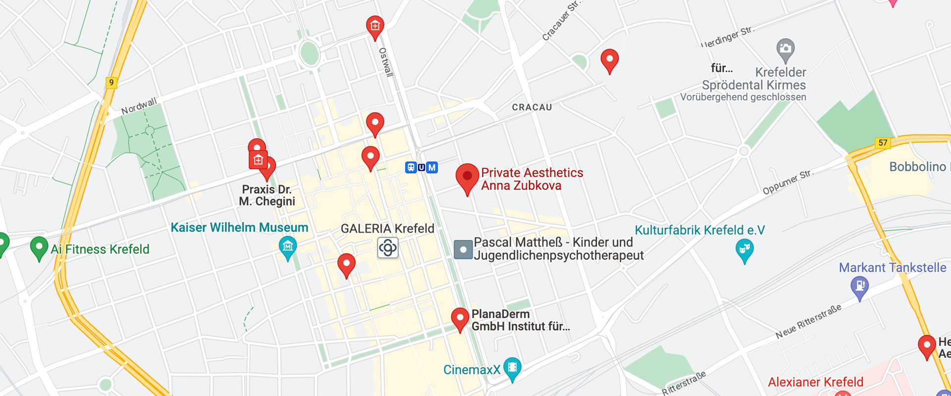 Die Praxis befindet sich vor den Toren Düsseldorfs und im Herzen Krefelds mit optimaler Anbindung an die öffentlichen Nahverkehrsmittel und Parkmöglichkeiten. Der Hauptbahnhof ist 5-10 Gehminuten und der Flughafen Düsseldorf knapp 30 Fahrminuten entfernt.
